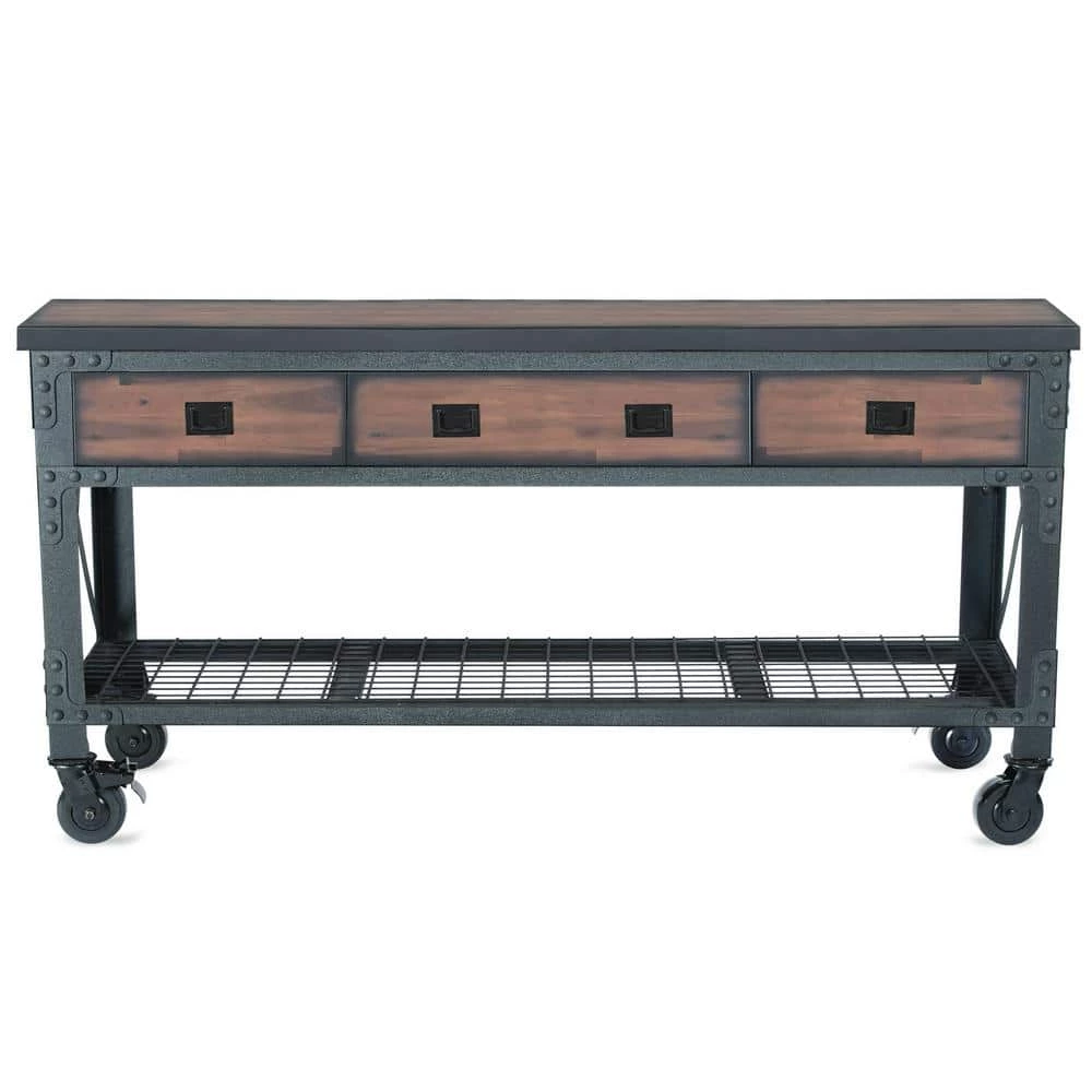 The Duramax 72 in. W x 24 in. D rolling workbench is ideal for all applications whether in a garage, workshop or as a piece of furniture. It is constructed with heavy-duty powder coasted steel frame with a solid rubber wood that features our proprietary durable hand coated finish. The 3 pullout drawers feature sturdy ball bearing slides and can each support up to 100 lbs. of weight. The lower wire shelf base is strong enough to hold up to 200 lbs. and add valuable real estate space while the heavy-duty casters ensure that it can be moved to any location at ease and the 2 locking casters secure it in its position.