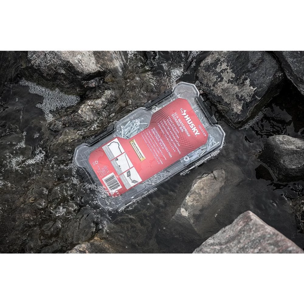 Husky 12 in. waterproof storage bin is perfect for protecting your items from the elements. This organizer is constructed of Heavy-duty polymer to ensure durability and quality for life of the case. The dividers are easily removed to create dozens of custom configurations for a wide variety for storage possibilities. Rugged, over-center latches work with the silicon O-ring to create a waterproof seal good for 25 ft. of submersion for up to 60-minutes.