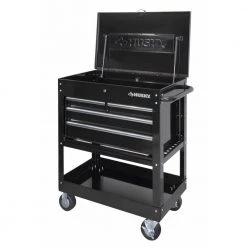 The Husky 33 in. 4-Drawer Mechanics Tool Cart is a heavy-duty utility cart that is essential in the shop, garage or even the office. The multi-sized drawers are equipped with 75 lbs. rated ball bearing slides to hold a variety of tools. The bottom storage tray is reinforced steel for your larger, heavier items and has approximately 14.5 in. of storage space height. The top storage area is a perfect place to keep your commonly used items easily within reach. In addition, the top storage area of the tool cart includes a locking lever to secure the 4-drawers and a keyed lock to secure the lid. The larger, push-bar handle and heavy-duty, 5 in. x 2 in. casters allow this cart to be easily moved around your work area. With no clumsy washers and nuts to deal with, this tool cart can be assembled in minutes with the included bolts and pre-mounted threads.