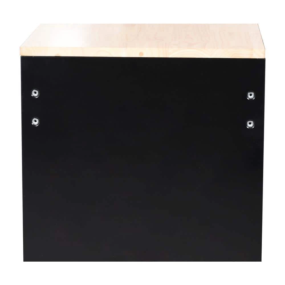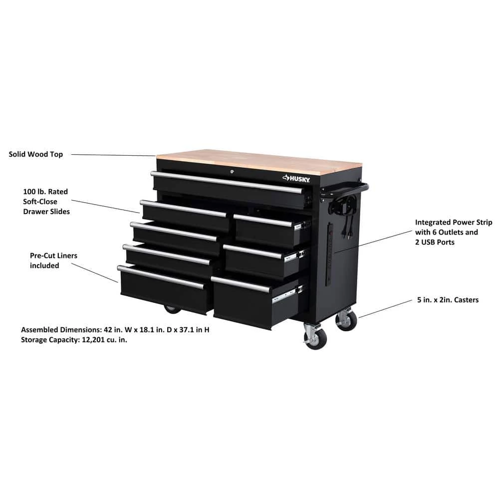 The Husky 42 in. W x 18.1 in. D 8-Drawer Black Mobile Workbench with Solid Wood Top is here. This workbench is constructed of 21-Gauge steel and has a large wood surface for all your projects. The 8-drawers combine for 12,201 cu. in. of storage space. All drawers glide effortlessly on 100 lbs. rated ball-bearing slides. These slides are also equipped with a soft-closing mechanism that prevents your drawers from slamming shut. Each drawer also has a pre-cut liner inside to help keep your tools in place. On the side of the workbench is an integrated power strip that has 6 outlets and 2 USB ports. Storage hooks are available when cord is not in use. Finally, there are 5 in. x 2 in. casters and a push handle that will allow you to move the workbench around your work space with ease.