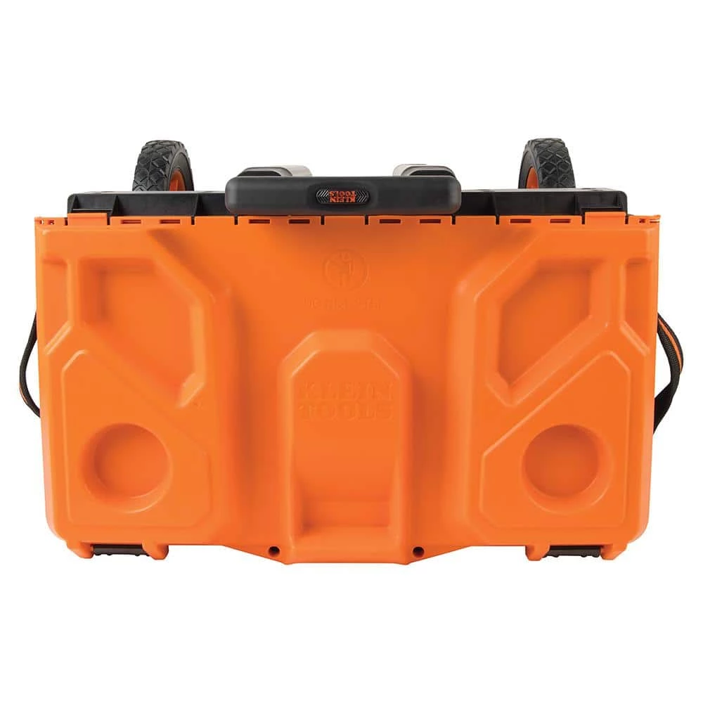 The rugged Tradesman Pro Tool Master Rolling Tool Bag from Klein Tools will easily roll over tough terrain with 8-Inch (203.2 mm) wheels, high clearance, and a heavy-duty telescoping handle. Transport up to 250-Pounds (113 kg) of your tools in the wide open interior. Organize smaller items in 19 pockets inside and out, all constructed with durable1680d ballistic weave material. The hard top allows for stacking and has compartments to hold your cell phone, beverages, or small parts. Twist-lock Klein LED Light or Wireless Speaker on front mount (items sold separately).