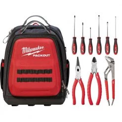 Enjoy the durability and versatility of this impact-resistant PACKOUT Backpack. Featuring a molded base that connects with other PACKOUT systems via integrated locking cleats, this backpack is constructed from 1680D ballistic material for proven durability. Its 48 total pockets includes a hard-shell pocket made for sensitive equipment to deliver exceptional organization. This backpack includes ample padding and reinforced side walls. It has daisy chains for additional storage, a tape measure clip and heavy-duty zippers. The Milwaukee 6-Piece Screwdriver Kit features hardened tips and forged shanks to provide users with professional grade solutions and durability. The screwdriver bit types are marked on each tool’s cap for fast identification. The comfortable tri-lobe handles allow users to comfortably apply more leverage and magnetic tips help hold screws in place while driving. The Milwaukee 3-Piece Pliers Kit provides solutions for a wide range of cutting and fastening application. Milwaukee pliers feature over-molded comfort grips, which will not peel under jobsite conditions. All Milwaukee pliers are forged for strength and feature rust protection for long life. Kit includes 1 backpack, 6 screwdrivers, and 3 pliers.