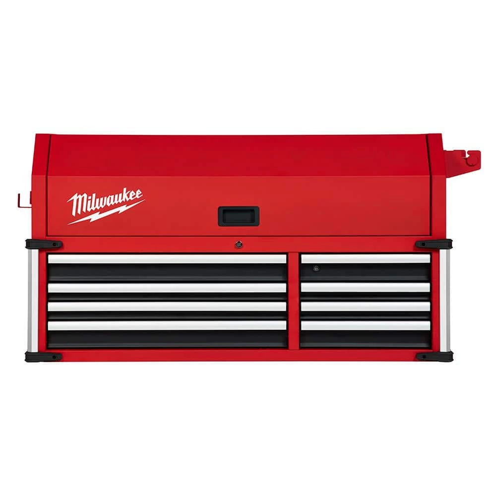 Loaded with the extra features you want, the Milwaukee 46 in. 8-Drawer tool cabinet boasts a massive 15,877 cu. in. of storage capacity and can hold 1,000 lbs. The 8-drawer chest is an extra-deep 22 in., which is 4 in. deeper than most other units. The chest lid has 10.5 in. clearance and a thick top mat with a Milwaukee-embossed logo. The extensive list of features includes an integrated peg wall in the chest, paper towel holder, 2 J-hooks to store your hoses and cords, and stylish aluminum edge guards with rubber corner bumpers to help protect your investment. Keep all your power tools powered up even while the unit is locked with the integrated 6 outlet/2 USB power center in the top till. Easily use and store your laptop or paperwork in the innovative pullout work surface drawer. Barrel key locking system secures all your valuables and there is a separate privacy drawer that can be locked while the rest of the drawers remain open. The 100 lbs. rated, soft-close, ball bearing drawer slides gently retain the drawers from accidental opening or slamming shut. The red and black textured finish is rugged, durable, and stands up to harsh environments. This tool chest has it all.